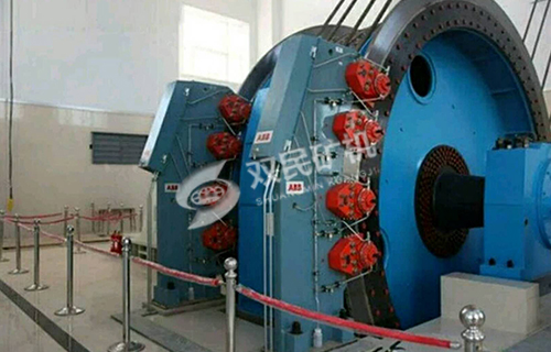 JKMD型多繩摩擦式提升機采用低速電動機時可不用減速器,電動機直接與卷筒主軸相連,或將電動機轉子裝在卷筒主軸的末端。傳動功率大時,可采用2臺或4臺電動機同時驅動。一臺提升機的總功率已達到11600千瓦。制動系統是保證提升機安全運行的重要裝置。遇緊急情況時,制動系統應通過可調節制動力矩的液壓系統產生兩級安全制動,以保證提升機及時停車又不生產制動過猛現象。交流電動機驅動的提升機。其制動系統還要具有靈敏的制動力矩可能性能,以準確控制提升機在臨近通車點時的運行速度。